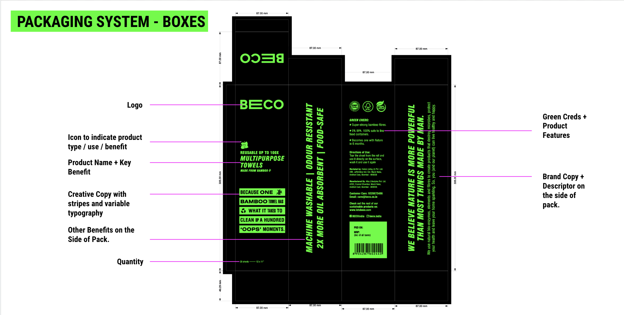 When we set out to give Beco a new look, one of the problems that we had found was that many customers mispronounced their name. Many didn’t recognise that the name was an amalgamation of ‘Be Eco’. To combat this, we decided to typographically lay emphasis on the keyword (ECO) that was so core to the brand’s existence by stretching the E. This gave shape to the treatment of typography on all of their packaging, and we extended it to their website too.